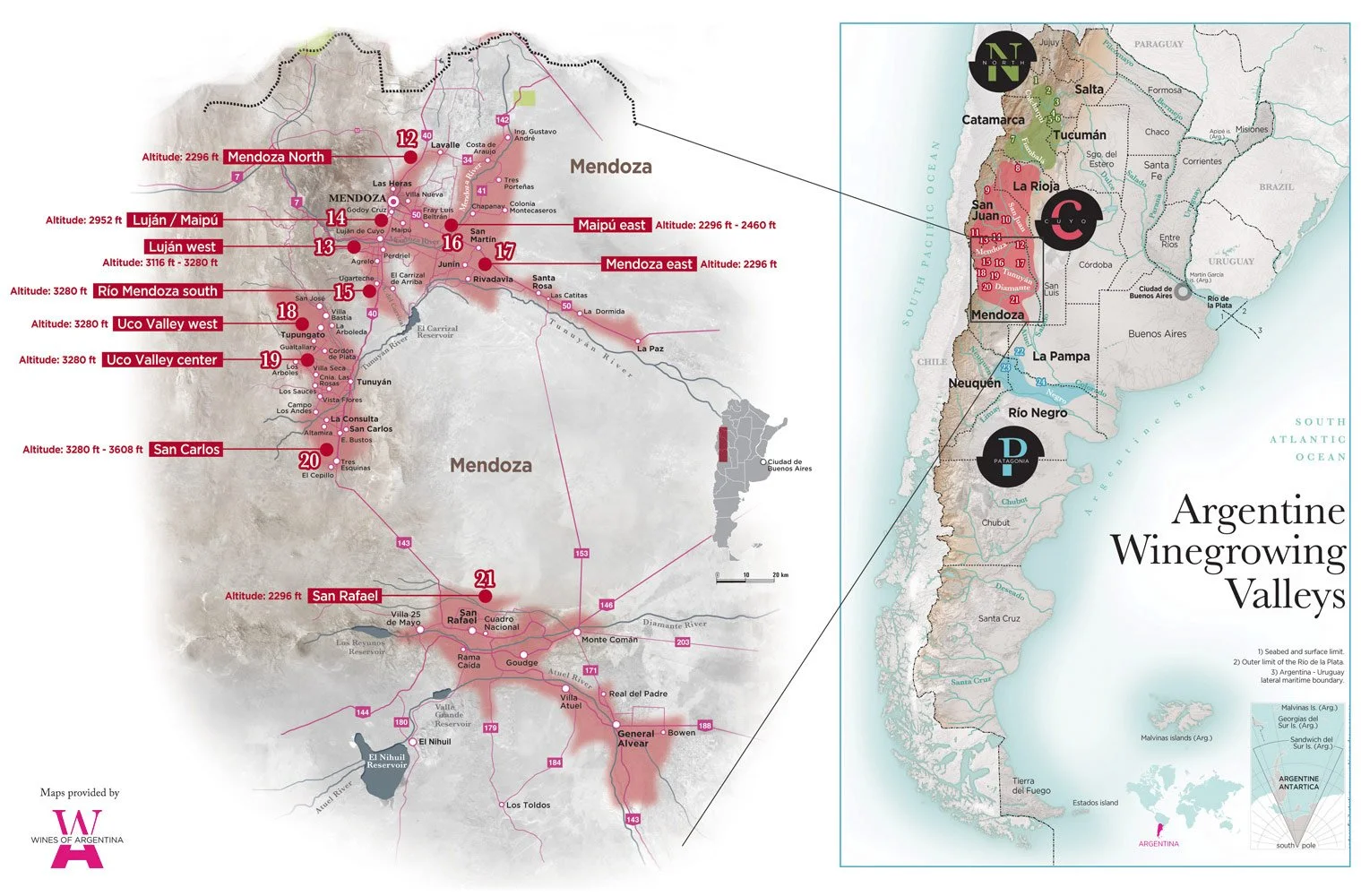 Winemaking regions of Argentina, showing the location of the Uco Valley within the Mendoza region. Map provided by Wines of Argentina.